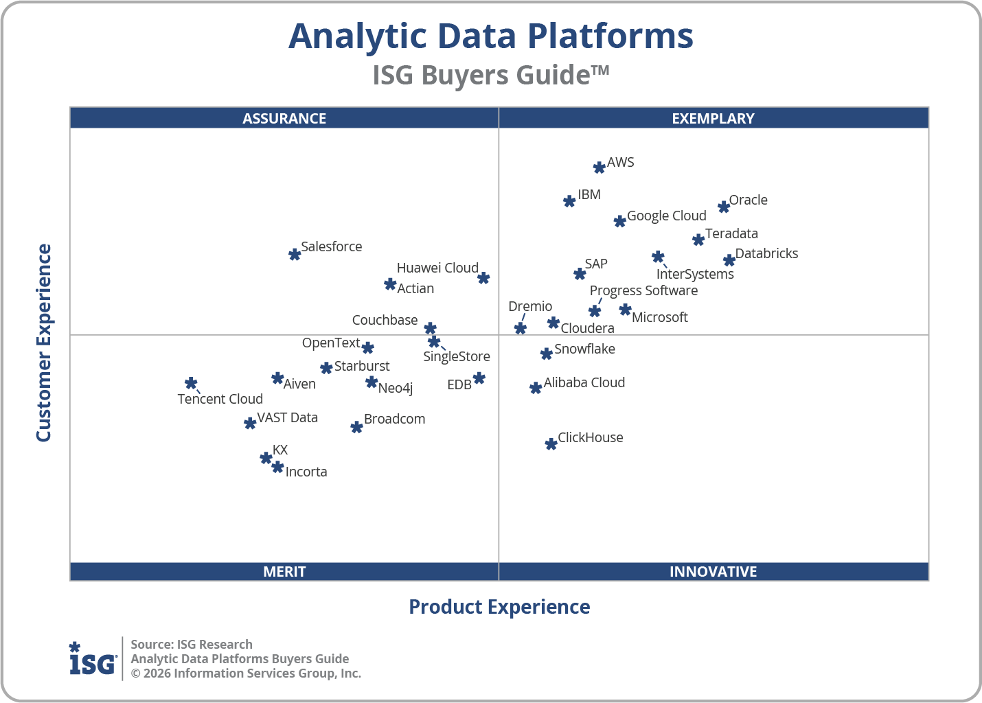 Teradata has been recognized as Exemplary—the highest designation—across seven 2026 ISG Buyers Guides™ for 2026, spanning AI platforms, agentic AI, governance, and analytic data platforms. This recognition reflects consistent strength across product capabilities, customer experience, and real-world enterprise requirements.