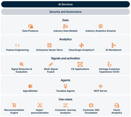 Teradata’s AI Services help deploy the Customer Intelligence Framework at enterprise scale while maintaining security, governance, and cost predictability. Teradata teams deliver data engineering and pipeline management; deploy capabilities to support AI such as Enterprise Vector Store and ModelOps; and deliver integration and development for agents including AgentBuilder and MCP server, all with a data governance structure designed to promote trusted and secure results. The Customer Intelligence Maturity workshop can identify gaps in existing strategies and architecture that may impact autonomous customer intelligence and outlines how Teradata can help.